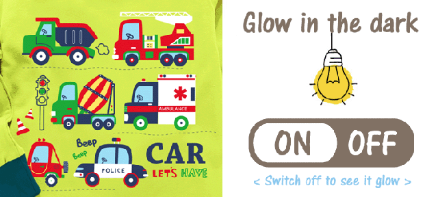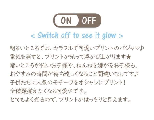 光るプリントのパジャマとは、明るい所で光りを溜めておくと、暗い所で蓄光プリントが光る、こども達にもママ達にも大人気のパジャマです。
