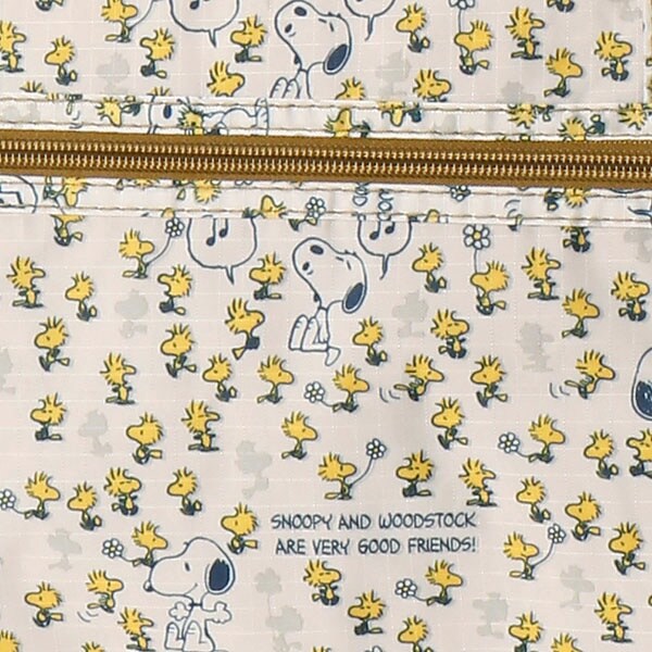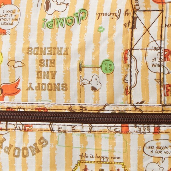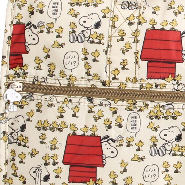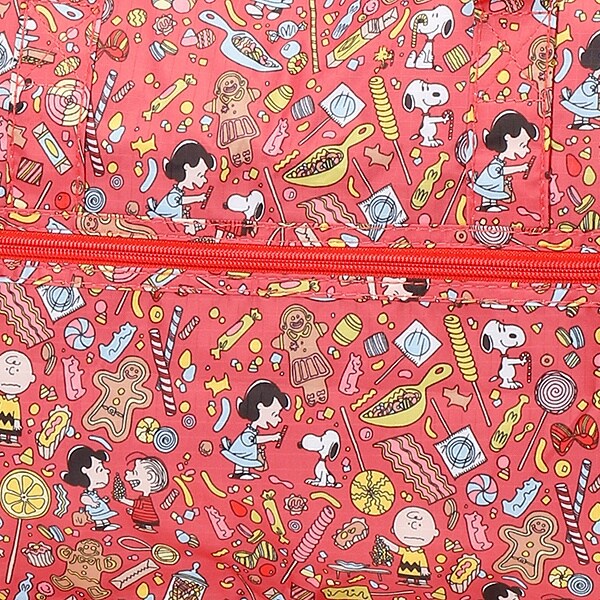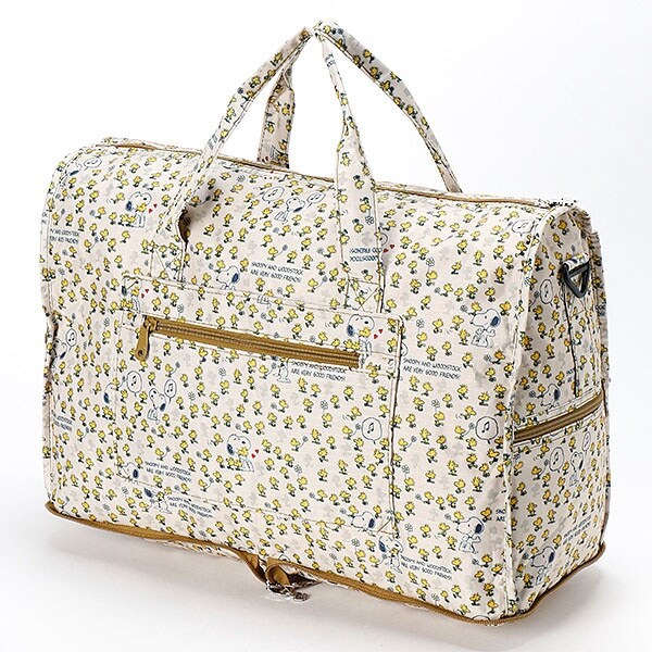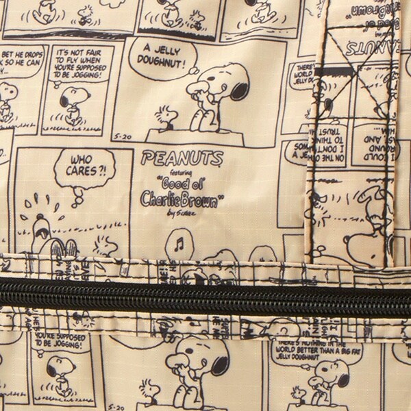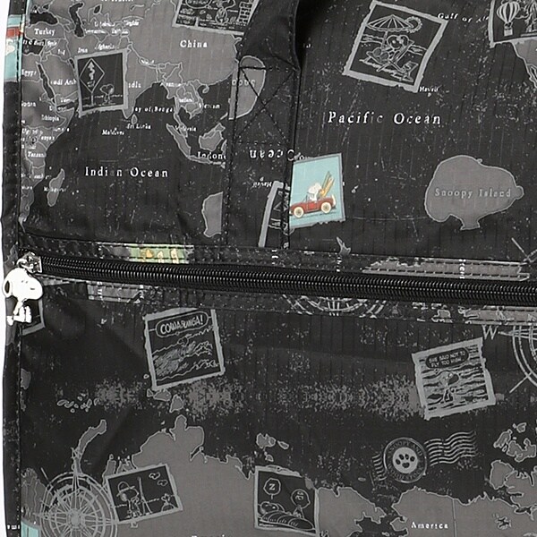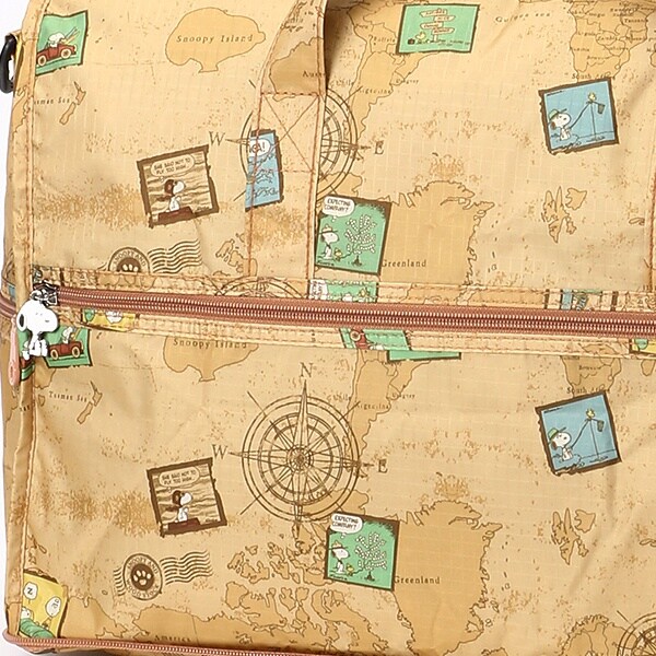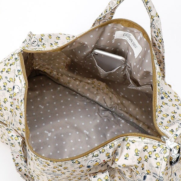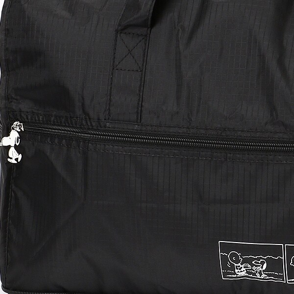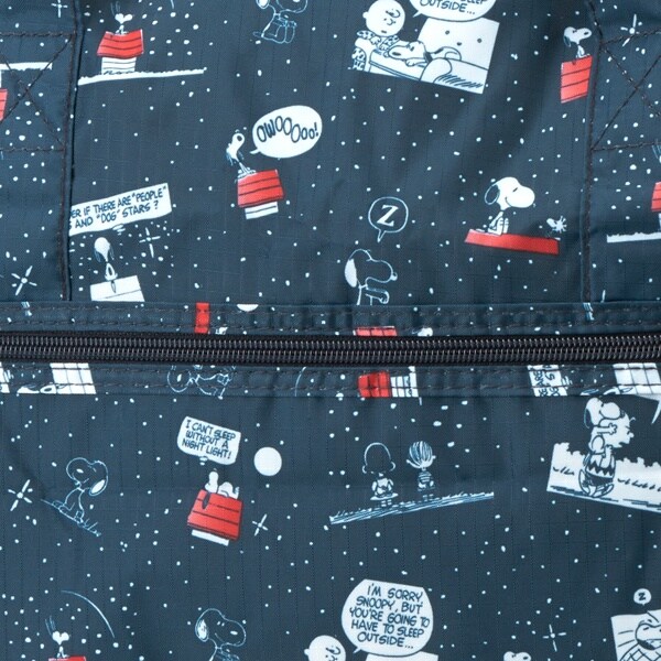 小さく持って大きく使える!持ち運ぶ時は折りたたんでコンパクトに♪荷物が増えたらサッと広げて使えます。旅行だけでなく、普段使いのサブバッグやショッピングバッグにもおススメです!スーツケースのキャリーバーに通して持ち運ぶこともできます。ファスナートップ、内装にもこだわり、細部にもスヌーピーの世界を感じることができます。