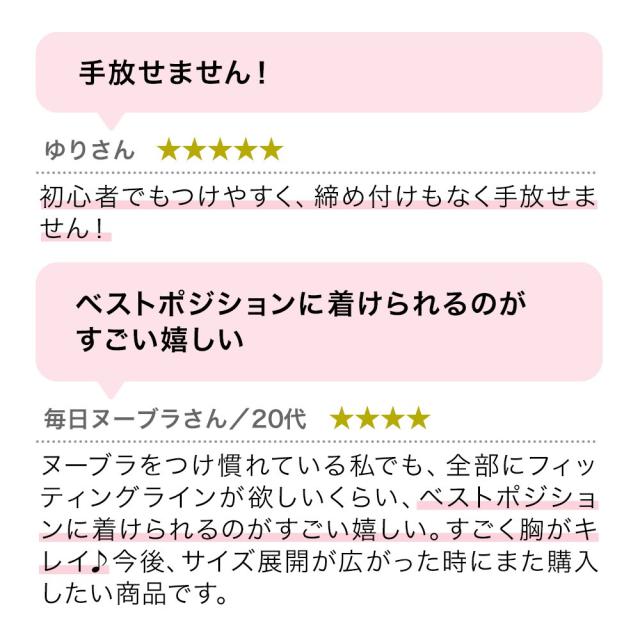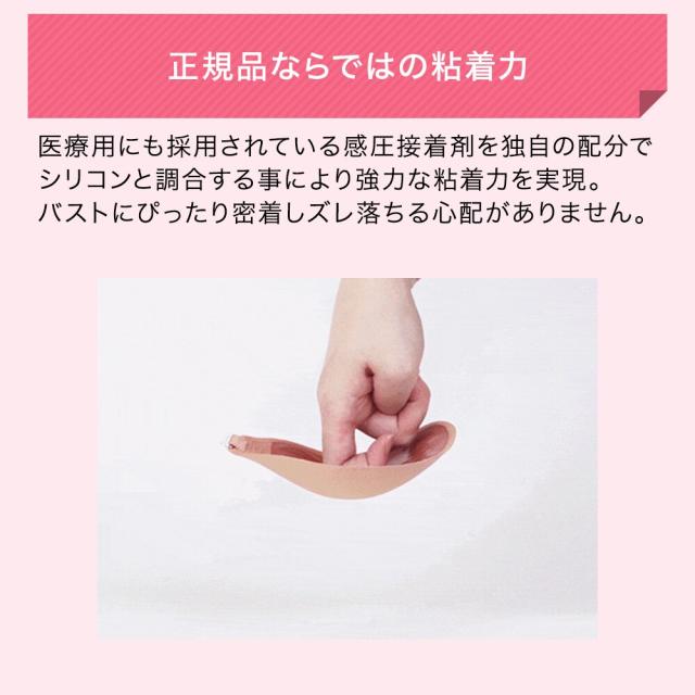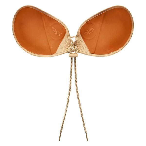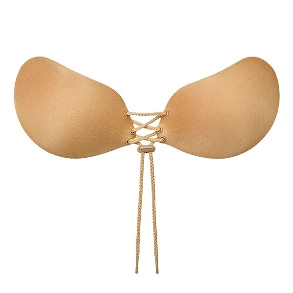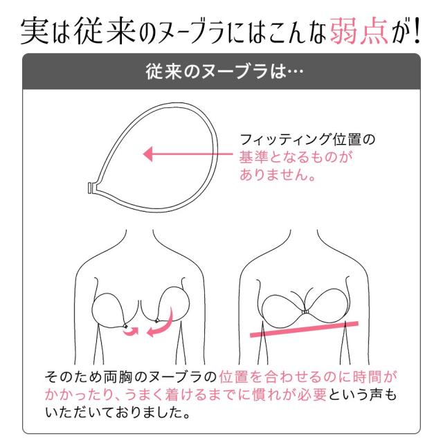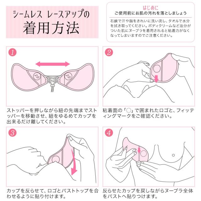 フィッティングマークに沿ってバストに貼り付け、ヒモを締めるだけで誰でも簡単にバストメイクできるヌーブラです。