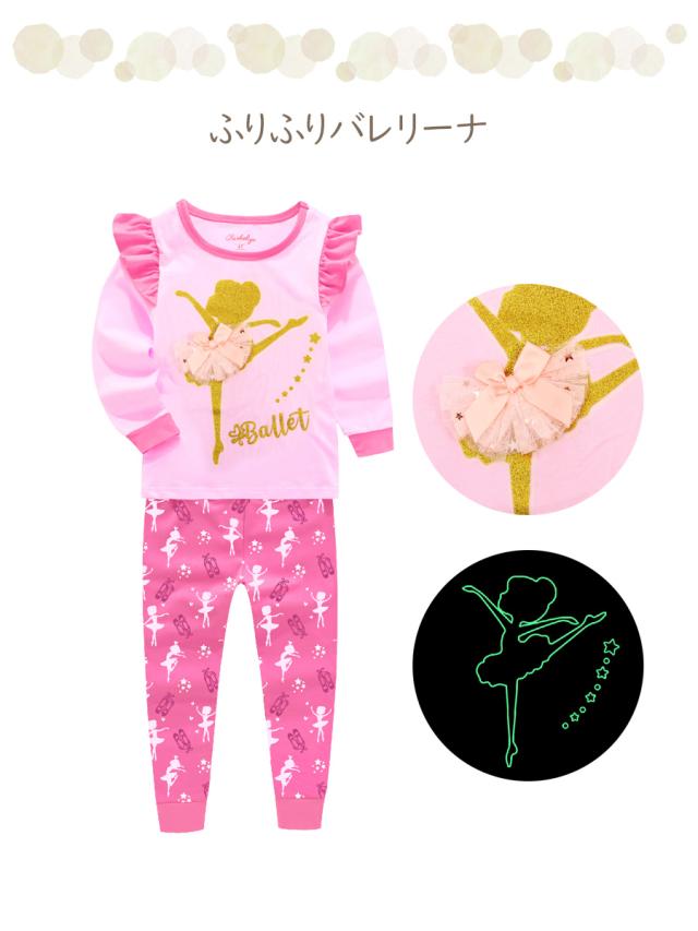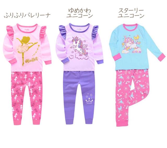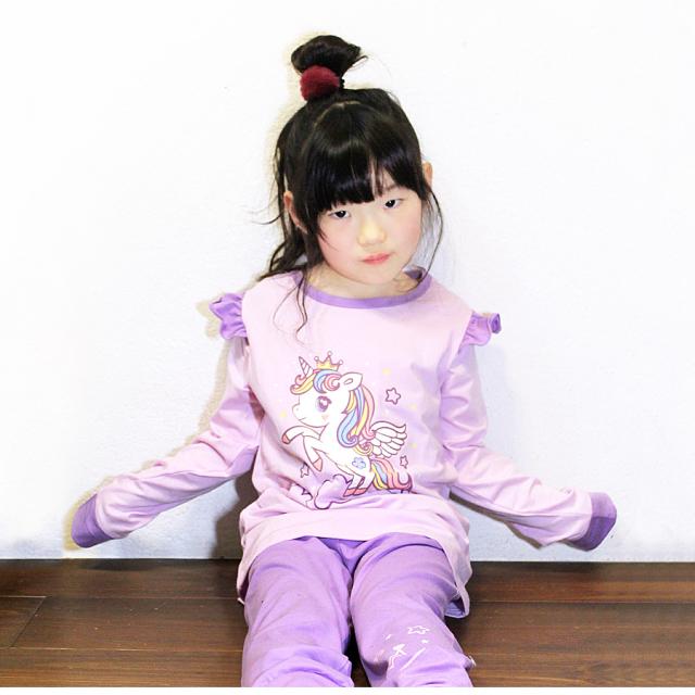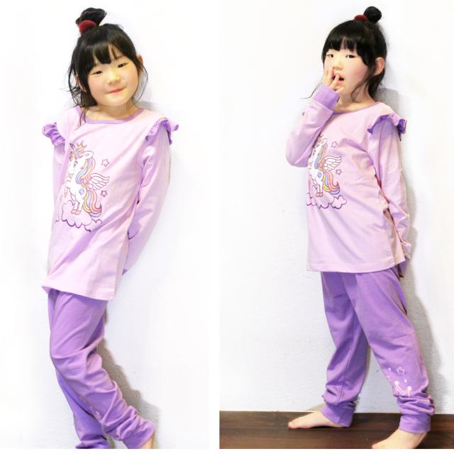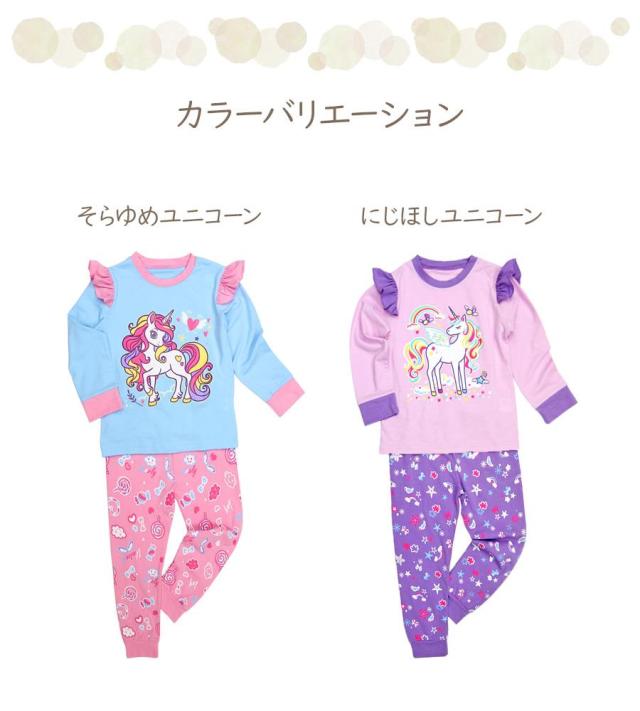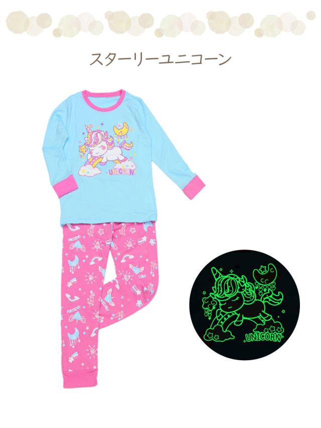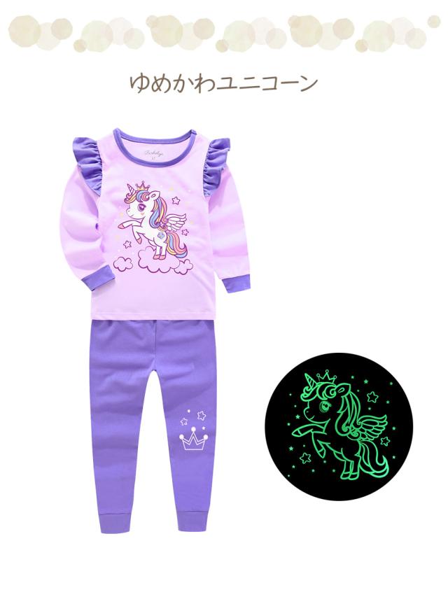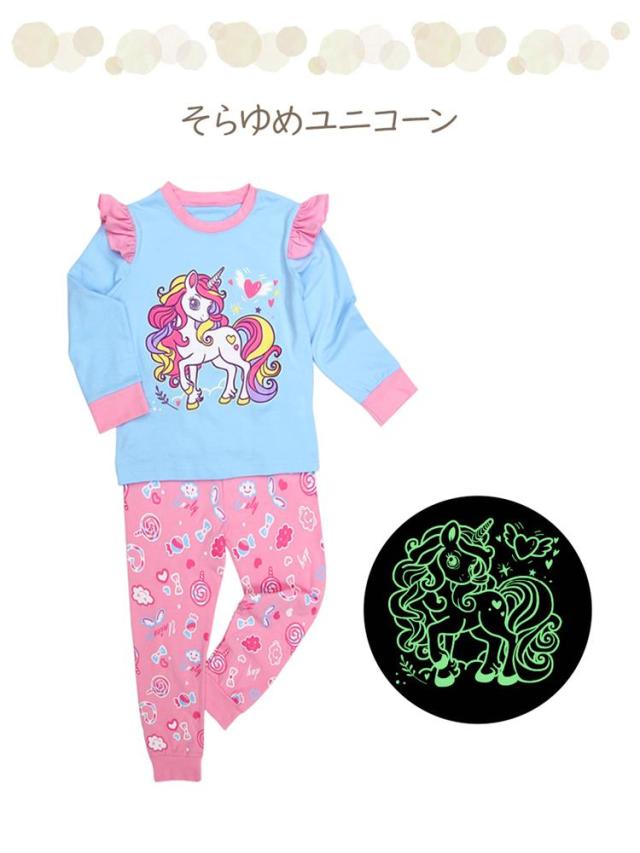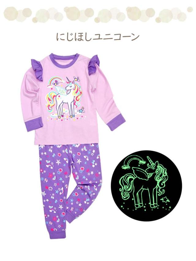 光る プリント パジャマ 長袖 セットアップ 上下セット 蓄光 女の子 キッズ ジュニア フリル 春 秋 冬 ユニコーン メール便
