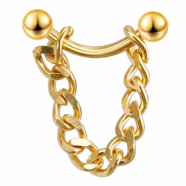 金メッキしたシンプルな16ゲージのボールタイプのへそピアス型ボディピアスに喜平チェーンを通したスタイリッシュなアイテム。バナナバーベル型なので、ヘリックスや耳たぶ、トラガスはもちろん、アイブロー(眉のピアス)や臍ピアスとしても使える。シンプルなフォルムはどんなスタイルにも似合い、メンズでもレディースでも使えるおしゃれなボディーピアス。ペアルックやプレゼントにも最適。