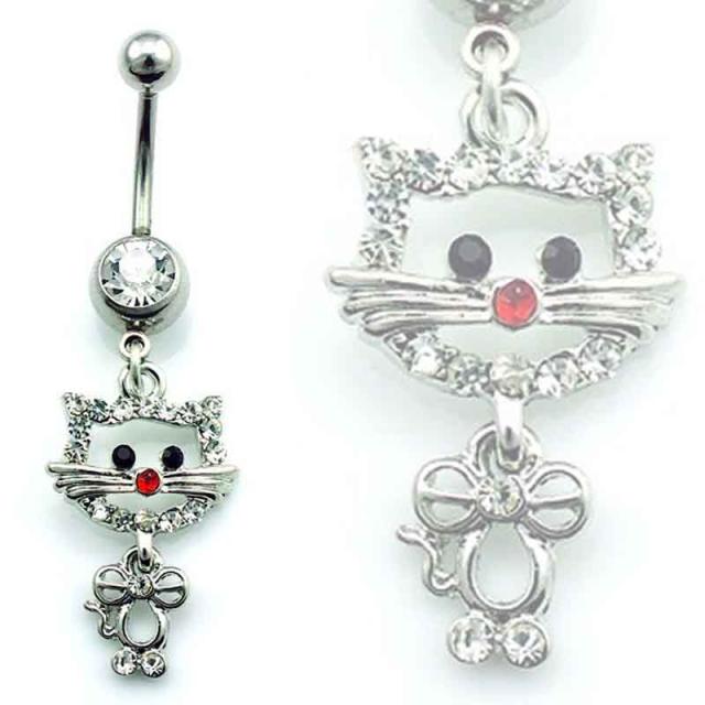 大きな猫の顔にクリスタルとブラックとレッドのキュービックジルコニアを並べた可愛い臍ピアス型ボディピアス。