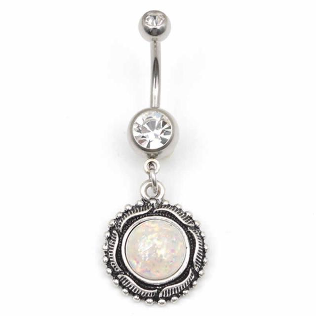 [14G おへそのピアス] ラウンドオパールチャーム へそピアス 14ゲージ ボディピアス ボディーピアス ヘソピアス 臍ピアス メンズ レディース カーブバーベル サージカルステンレス316L ネイブル 丸型 ラインストーン ジルコニア クリスタル 天然石風 ホワイトオパール