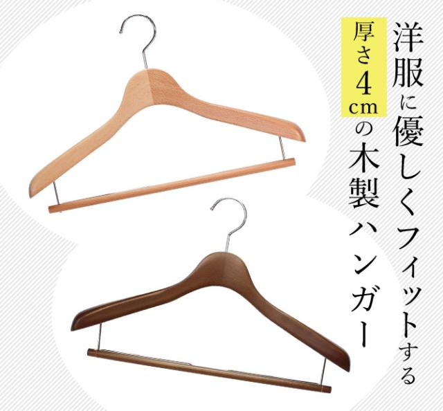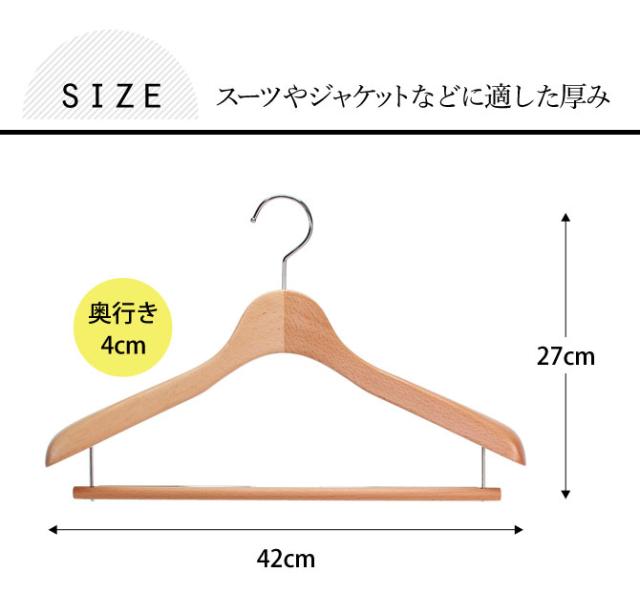洋服に優しくフィットする厚さ4cmの木製ハンガー肩先に厚みがあり、肩に沿って湾曲したラインがスーツやジャケットの型崩れを防ぎます。