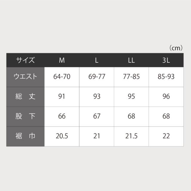 ■サイズ:M/ウエスト64-70、ヒップ87-95、総丈91、股下66、裾幅20.5、ワタリ/27、L/ウエスト69-77、ヒップ92-100、総丈93、股下67、裾幅21、ワタリ/29、LL/ウエスト77-85、ヒップ97-105、総丈95、股下68、裾幅21.5、ワタリ/31、3L/ウエスト85-93、ヒップ102-110、総丈96、股下68、裾幅22、ワタリ/33cm
