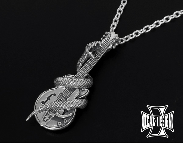 細部まで丁寧に彫りこまれたギターに、リアルなヘビが巻きついたシルバーペンダント。
