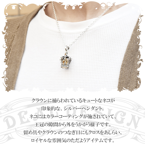 クラウンに捕らわれているキュートなネコが印象的な、シルバーペンダント。
