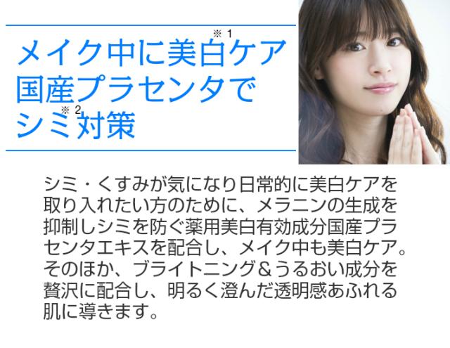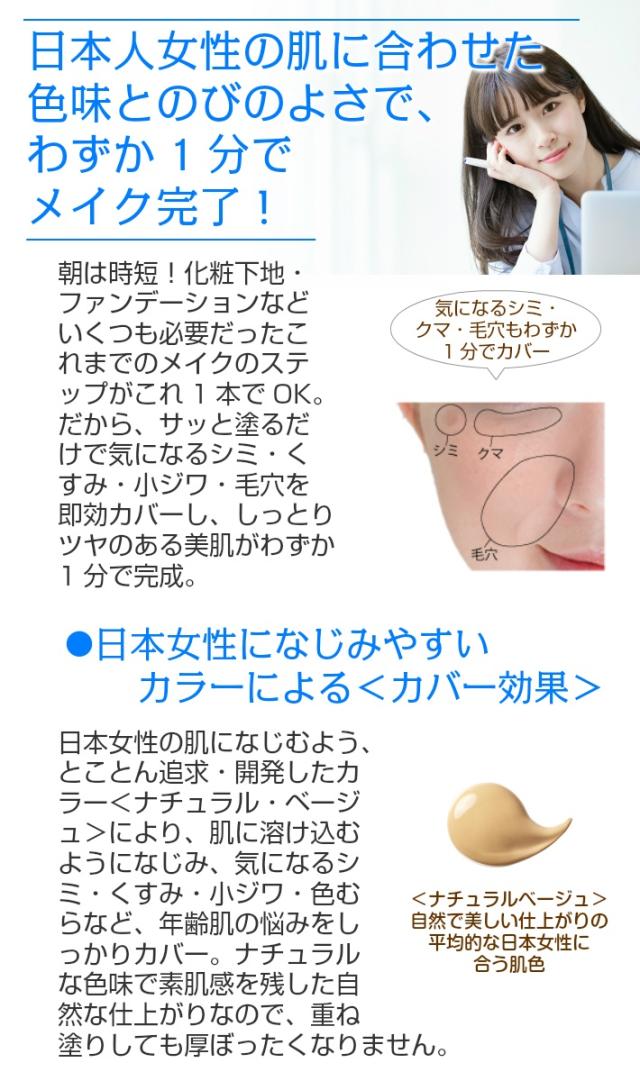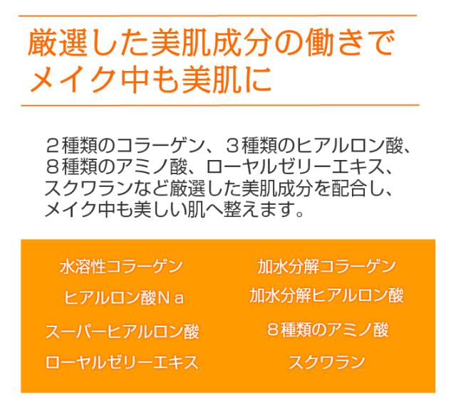 精製水、メチルポリシロキサン、微粒子酸化チタン、デカメチルシクロペンタシロキサン、1,3−ブチレングリコール、酸化亜鉛、ポリオキシエチレン・メチルポリシロキサン共重合体、トリメチルシロキシケイ酸、メチルフェニルポリシロキサン、水酸化アルミニウム、イソステアリン酸、L−システイン、(2S,3R)−2−オクタデカノイルアミノオクタデカン−1,3−ジオール、N−ステアロイルフィトスフィンゴシン、ヒドロキシステアリルフィトスフィンゴシン、イソステアリン酸フィトステリル、5’−イノシン酸二ナトリウム、5’−グアニル酸二ナトリウム、L−チロシン、L−アルギニン、L−プロリン、L−フェニルアラニン、アラントイン、L−イソロイシン、DL−アラニン、L−アスパラギン酸ナトリウム、L−スレオニン、L−バリン、L−セリン、L−ヒスチジン塩酸塩、L−ロイシン、グリシン、L−グルタミン酸、塩酸リジン、タウリン、アセチル化ヒアルロン酸ナトリウム、濃グリセリン、トレハロース液、カッコンエキス、アロエエキス(2)、クロレラエキス、ヒアルロン酸ナトリウム液、加水分解ヒアルロン酸、ダイズエキス、加水分解コラーゲン(4)、水溶性コラーゲン液、ローヤルゼリーエキス、トリベヘン酸グリセリル、PEG−9 ポリジメチルシロキシエチル ジメチコン、ペンタステアリン酸デカグリセリル、ステアロイル乳酸ナトリウム、ナイロン末、セリサイト、メチルハイドロジェンポリシロキサン、酸化アルミニウム、ベヘニルアルコール、メチルシロキサン網状重合体、ポリアクリル酸アルキル、塩化ナトリウム、フェノキシエタノール、酸化チタン、黄酸化鉄、ベンガラ、黒酸化鉄