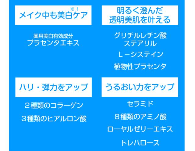 酸化チタン、酸化亜鉛、シリカ、タウリン、リシンHCl、グルタミン酸、グリシン、ロイシン、ヒスチジンHCl、セリン、バリン、アスパラギン酸Na、トレオニン、アラニン、イソロイシン、アラントイン、フェニルアラニン、アルギニン、プロリン、チロシン、イノシン酸2Na、グアニル酸2Na、アセチルヒアルロン酸Na、スクワラン、ヒアルロン酸Na、加水分解ヒアルロン酸、 加水分解コラーゲン、水溶性コラーゲン、ローヤルゼリーエキス、ジメチコン、アルミナ、ポリメチルシルセスキオキサン、ヒドロキシアパタイト、水、BG、マイカ、酸化鉄