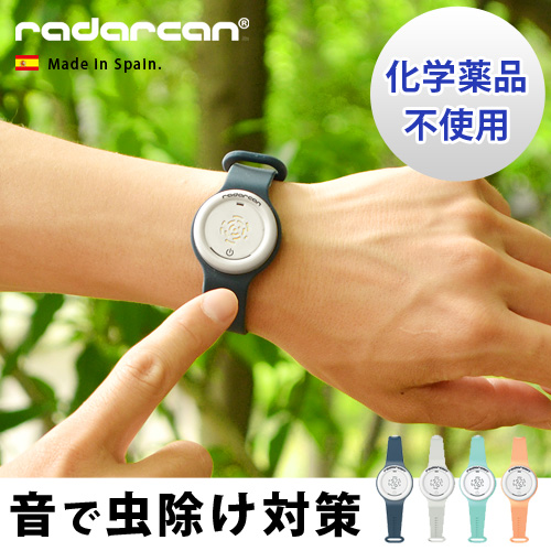 ラダキャンの「PORTABLE REPELLER PLUS R-100」は、虫が嫌がる低周波音を使用して虫を寄せ付けない新発想の防虫アイテムです。化学薬品を一切使用していないので無臭無害な安全性の高さがメリット。赤ちゃんやペットのいるご家庭でも安心してお使いいただけます。シンプルな腕時計のようなデザインで見た目もスタイリッシュ。リストバンド部分は低アレルギー性のシリコン製で、柔らかな手触りです。腕に付けるのはもちろん、本体はリストバンドから取り外してもご使用いただけます。本体裏面のクリップを使って、帽子や服のポケット、ベビーカーなどに取り付けても◎