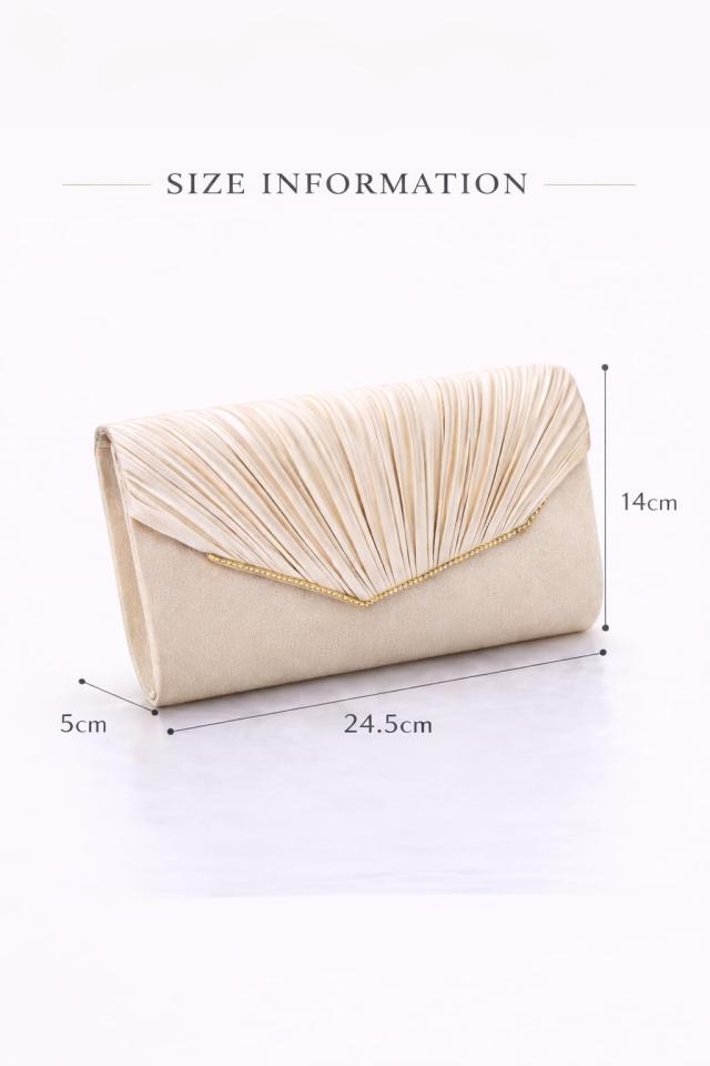 フロントに施した細やかなプリーツとさりげないビジューラインが、パーティードレスやお呼ばれドレス、結婚式お呼ばれの装いに上品なアクセントを添えます。
