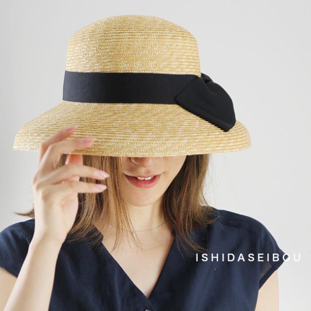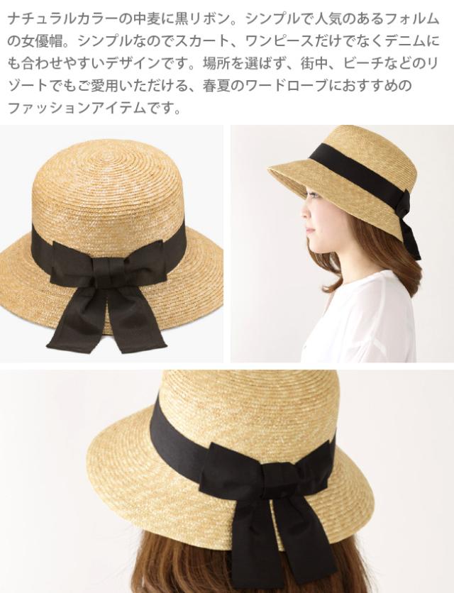 バックの結び目がワンポイントで可愛いデザイン。麦わらのナチュラルカラーにブラックリボンの定番スタイルです。