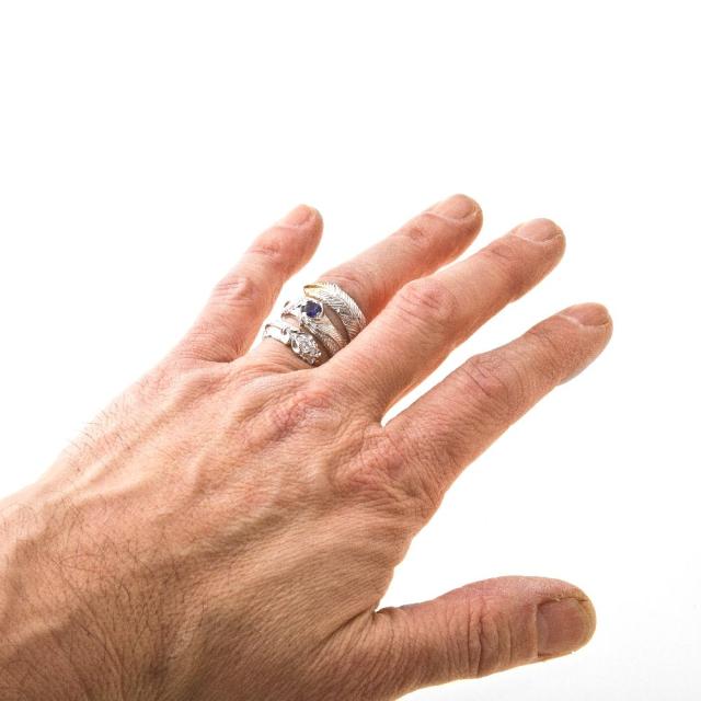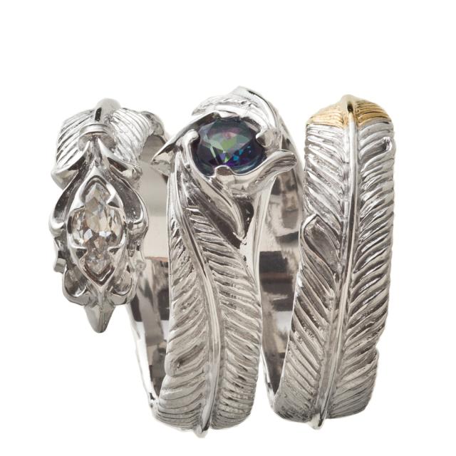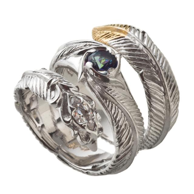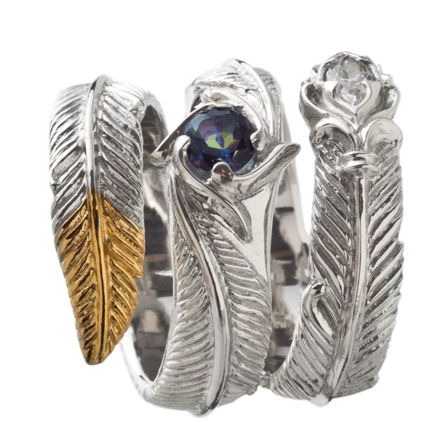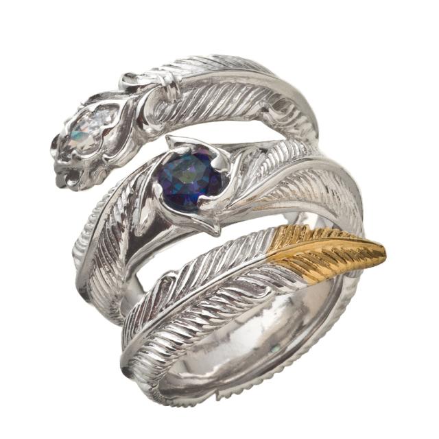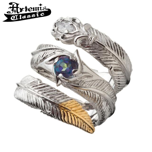 フェザーが3連に螺旋状に巻きつくようなデザイン。 人気のフェザーリングをアルテミスクラシックらしくアレンジ。 石はオーロラブルーに輝くミスティックトパーズとCZクリア。 フェザーは細かく繊細な彫り込み。 銀のラグジュアリーな繊細な輝きを堪能できる質感を活かした作り。 ●スペック