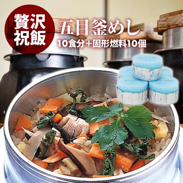 [前田家] 国産 | 五目釜飯 の具 ( 10人前 )+ 固形燃料 10個付 | 水を使わず即席で美味しい | 早炊き米 ・ 具 入り 釜めしの素 のセット | 料亭