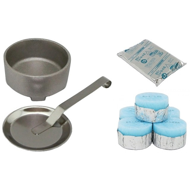 ◆≪火皿≫アルミ合金製の固形燃料用受け皿です。 陶器製の様に割れたりする心配がございません。ごく一般的に販売されている円柱型の固形燃料がぴったりおさまる受け皿です。 サイズ:内寸57mm 高さ32mm 重量:70g 材質:アルミ合金◆≪火消し蓋≫火皿にぴったり合うサイズのステンレス火消し蓋です。固形燃料の火を途中で消したいときに安全に消すことができます。 サイズ:φ62 / 全長133mm 重量:18g 材質:ステンレス◆≪固形燃料≫ 15g20個入|燃焼時間:約14分30秒〜19分(15gごと)|固形燃料15gの使用例:干物の網焼き | 適度な炎で効率よく燃焼しますので、料理を美味しくいやな臭いもありません。ご家庭での七輪・コンロ料理、鍋料理、チーズフォンデュはもちろん、業務用としても幅広くご利用いただけます。 アルミカップ付なので、片付けも簡単です。開封後は専用袋で保管します。 主成分:メタノール◆≪原産国≫(火皿・固形燃料):日本◆ 釜めしもよう 店主 推奨商品