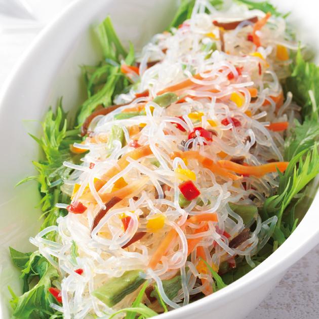 2種類の春雨をブレンドすることにより、冷やしてもボソボソと固くなりにくい春雨サラダです