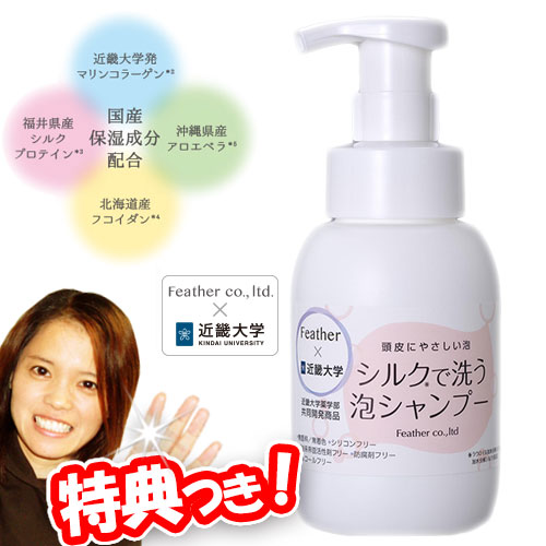 シルクで洗う泡シャンプー 300ml■商品詳細頭皮おもいのやさしい泡シャンプー容器は、泡で出てくるポンプタイプを採用近畿大学薬学部とフェザー株式会社による共同開発商品です。【国産保湿成分配合】近畿大学発のマリンコラーゲン、福井県産シルクプロテイン、北海道産フコイダン、沖縄県産アロエベラ葉エキス※適量(目安:3〜5プッシュ)手にとり、頭皮または、毛髪全体に優しく馴染ませてください。頭皮を指で優しくマッサージしたあと、十分に洗い流してください。◎弱酸性◎ヒトパッチテスト済(すべての方に肌トラブルがおこ......は個人差がございます。※おまけはお一人様につき1点となります。色などは選べません。シルクで洗う泡シャンプー 300ml 母の日 ギフト 父の日 ギフト 敬老の日 ギフト クリスマス ギフト お正月 子供の日 ギフト バレンタインデー ギフト ホワイトデー ギフト 可愛い おしゃれ オシャレ パーティー 入学祝い ギフト 卒業祝い ギフト 結婚記念日 ギフト お歳暮 ギフト お中元 旧正月 春節 お誕生日 などのプレゼントに大変申し訳ございませんが のし 包装は対応いたしておりません。