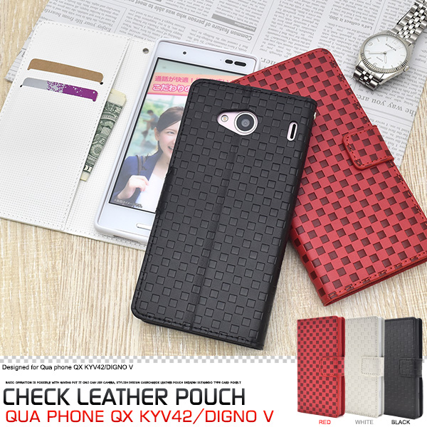 存在感抜群!市松模様レザーデザインの手帳型ケース。衝撃やキズなどからQua phone QX KYV42/DIGNO Vを守ります。また、内部はソフトケースなので着脱が簡単です。 背面を折り返すとスタンドとして使用できるので、動画視聴に便利です。落下防止に便利なストラップとストラップホール付きです。 横開きタイプなので、手帳のように使うことができます。また、内側に2つのカードポケットとサイドポケットが付いています。※スマートフォンは付属しません。※ライセンス商品ではありません ※カードは付属しません。