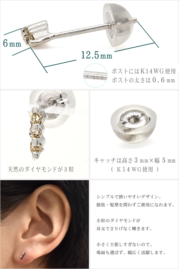 【素材】ダイヤモンド(天然・0.01ct(1粒あたり))、シルバー925、 K14ホワイトゴールド(※キャッチ・ポスト部分のみ)、ロジウムメッキ