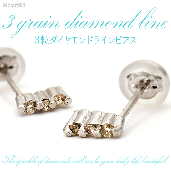シルバー925 天然ダイヤモンド0.03ct ラインピアス 。3粒のダイヤモンドとシルバーを組み合わせたシンプルなラインピアス。 小粒のダイヤモンドが、さりげなく耳元で輝きます。ファッションを選ばず身に着けられる、シンプルで使いやすいデザイン。ロジウムメッキなので変色・サビに強く、金属アレルギーの方に大変おすすめです!