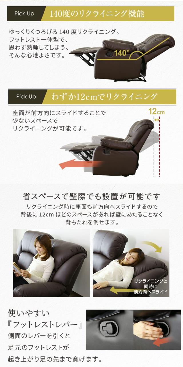 背もたれは最大140度までリクライニング可能。省スペース設計のため、壁際に設置してもスムーズに角度調整ができます。フットレストはレバーを引くだけで簡単に操作でき、足を伸ばして全身を預けるようなリラックススタイルを手軽に楽しめます。