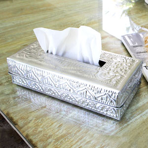 ハンドメイドのアジアン模様が全面に施された、当店の人気シリーズ。お部屋の光に当たると模様の凹凸部分がキラキラと光り、 また一味違った表情をみせてくれます。生活感が出やすいティッシュもこのケースに入れれば、お部屋の雰囲気を損わずお洒落なインテリアに早変わり!フタのように上部が開くので、中にティッシュ箱を入れるだけの簡単構造。しかもアルミ製だからとっても軽いんです。