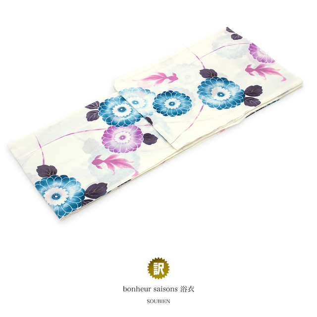 浴衣 レディース 訳あり bonheur saisons ボヌールセゾン 白 アイボリー 藍色 ピンク 菊 花 金魚 流水 ラメ 綿麻 夏祭り 花火大会 女性用 仕立て上がり 【フリーサイズ】