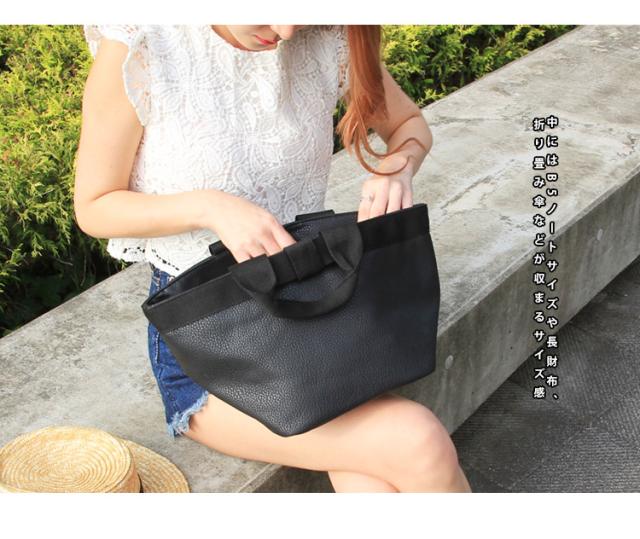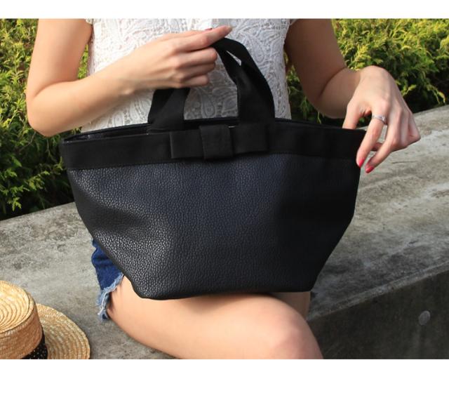 - マチが大きくて、たくさん入ってリボンが付いてて可愛くてお気に入り。黒なので合わせやすくて気軽に持っています。