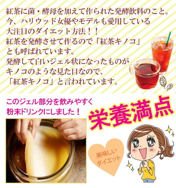 人気のダイエット、コンブチャのダイエットドリンク。飲みやすいストレートティー味。【名称】キノコキトサン含有食品【内容量】120g【原材料名】難消化デキストリン、紅茶エキス、食用酵母(マンガン、亜鉛、銅、クロム、モリブデン、セレン含有)、キノコキトサン、キャンドルブッシュ末、ギムネマ抽出物、玄米麹末、乳酸菌(殺菌)(乳成分を含む)、デキストリン【保存方法】高温多湿、直射日光を避け涼しい所に保存してください。【お召し上がり方】栄養補助食品として1日約5g(スプーン約2杯分)を目安に、約100ccの水またはお湯でよく混ぜてお召し上がりください。濃さはお好みで調節してください。【栄養成分表示】※1日摂取目安量(5g)あたり エネルギー:15.46kcal/たんぱく質:0.03g/脂質:0.01g/炭水化物:4.54g/食塩相当量:0.01g【製造国】日本【区分】日本製・健康食品【メーカー】株式会社グッドラックグローバル