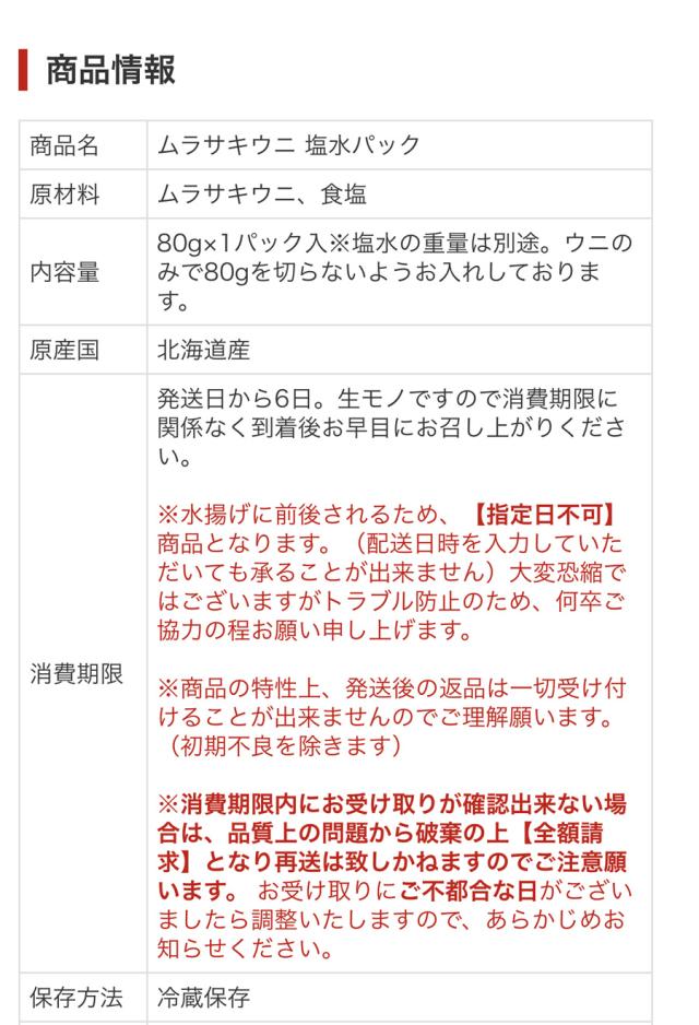 - 北海道産で塩水に浸かったウニだったので、とても美味しかったです。特に海外からのウニはミョウバン使用してるのであまり美味しくないですが、こちらのウニは塩水漬けなのでウニの甘味もあり良いと思います。また購...