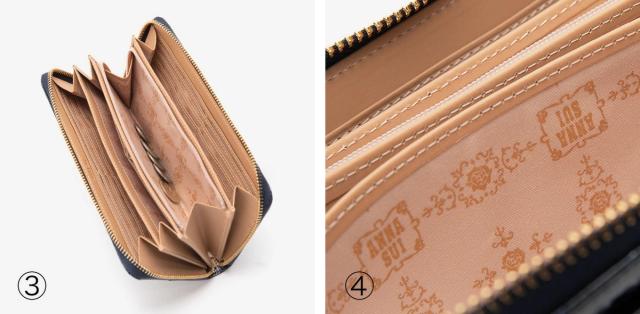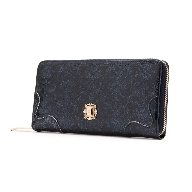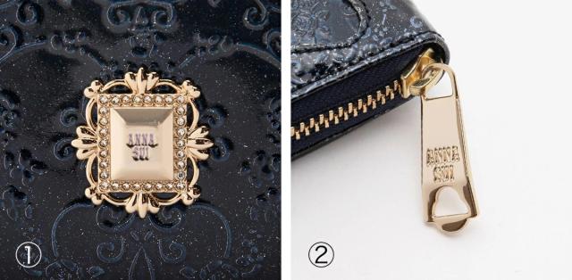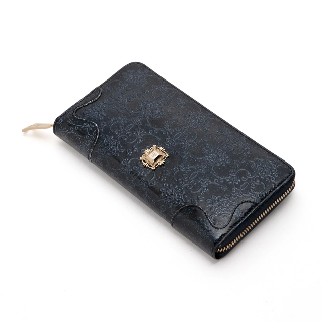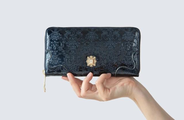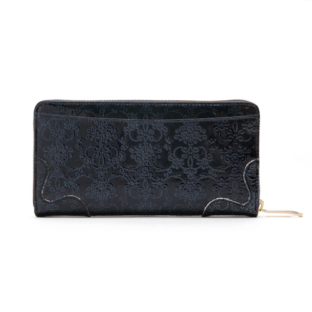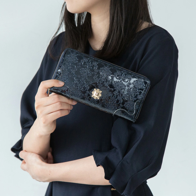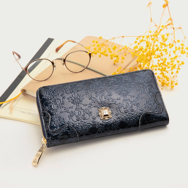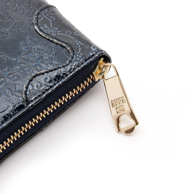 エナメル×ダマスクローズ柄の型押しで絶妙な質感と陰影が生まれ、アナ スイならではの妖艶な雰囲気を醸し出しています。甘すぎて派手になりがちなバラの総柄を、見事に品良く深みを持たせ、世界観が広がる仕上がりに。柄を存分に楽しめるのも長財布ならではの楽しみ。エンボス加工により傷汚れが付着しにくくお手入れが簡単なところも嬉しいポイントです。