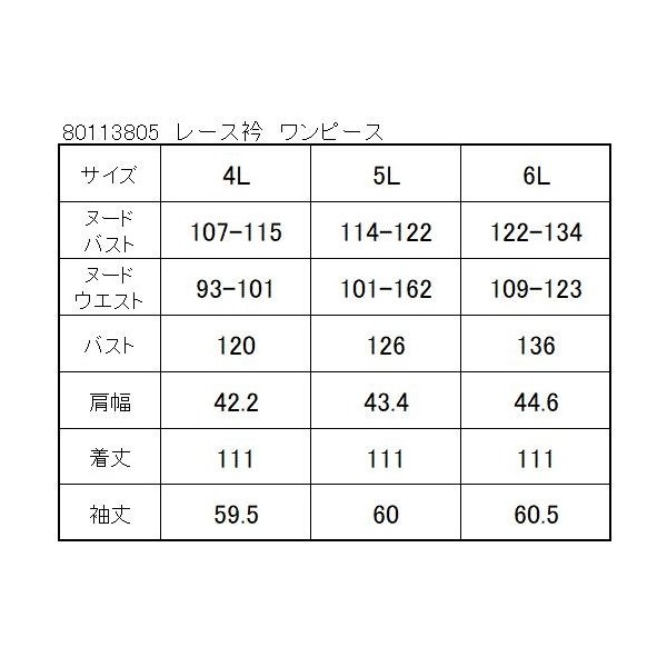 5Lサイズ ヌードバスト114-122 ヌードウエスト101-109 バスト126 肩幅43.3 袖丈60 着丈111