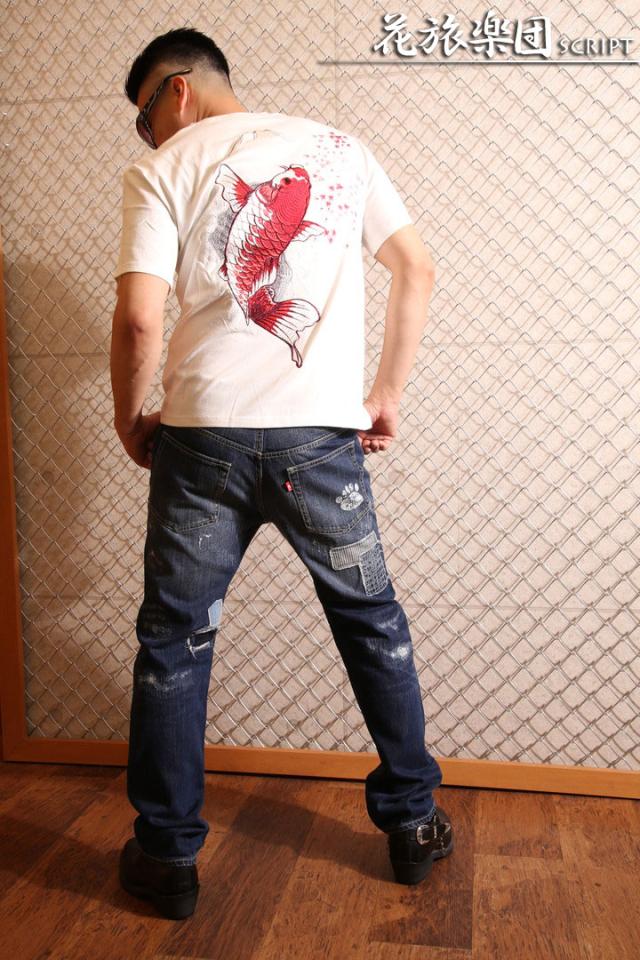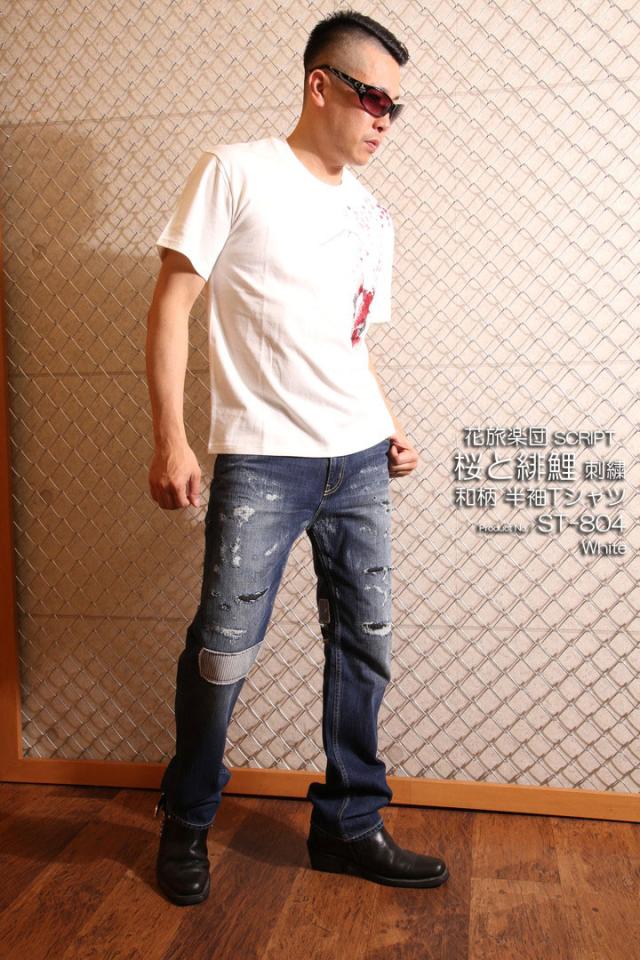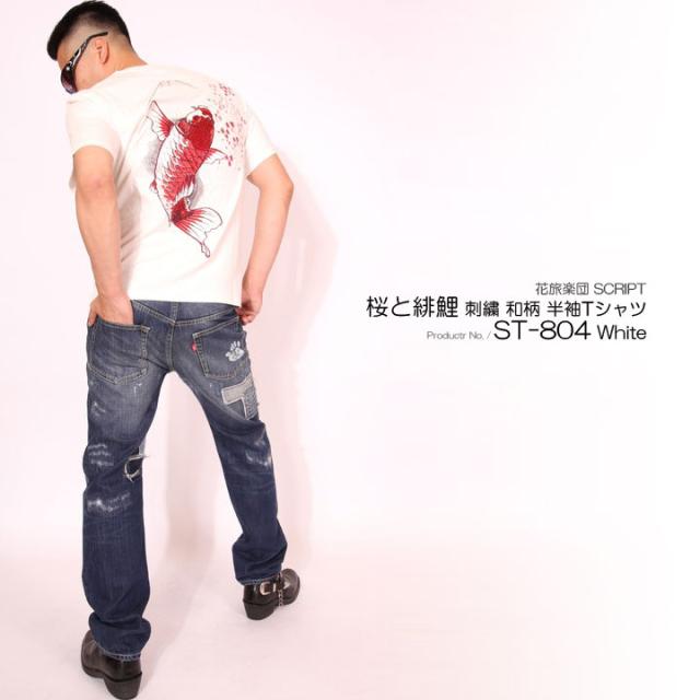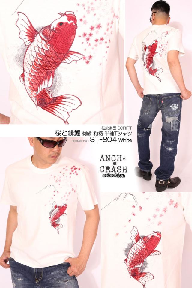 花旅楽団スクリプト 桜と緋鯉 刺繍 和柄 半袖 Tシャツ(ST-804)SCRIPT