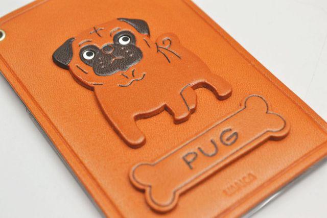 動物モチーフの本革製パスケースです。現在65種類×6色の390種!愛犬の名前を入れていつもいっしょにお持ち歩きください♪パグ レザーパスケース