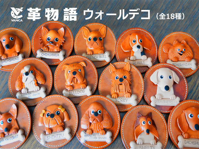 バンカクラフトの18犬種のワンちゃんがモチーフのウォールデコレーション(壁飾り)。本牛皮革をぜいたくに使った迫力のある立体的なデザインが特徴です。愛犬家さんへのプレゼントしても人気です。名入れして誕生日や新築祝い、進級祝いなどのお祝いのギフトにも!VANCAのこだわり