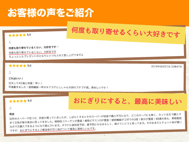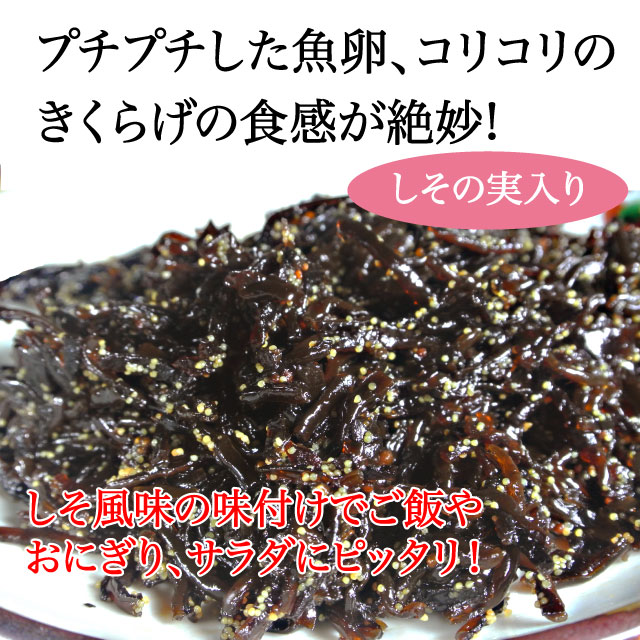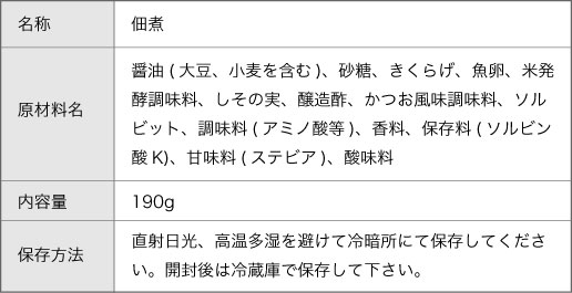 【原材料名】醤油(大豆、小麦を含む)、砂糖、きくらげ、魚卵、米発酵調味料、しその実、醸造酢、かつお風味調味料、ソルビット、調味料(アミノ酸等)、香料、保存料(ソルビン酸K)、甘味料(ステビア)、酸味料