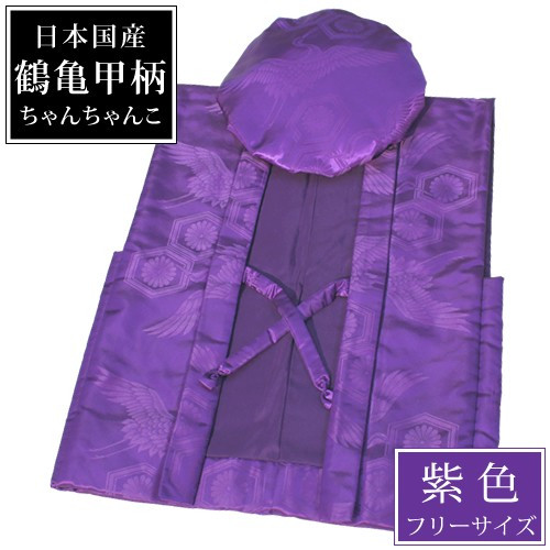 古希 喜寿祝い ギフト 国産ちゃんちゃんこ 70歳 77歳 紫色 頭巾付き フリーサイズ プレゼント 男性 女性 父 母 祖父 祖母 おばあちゃん おじいちゃん 鶴亀甲柄 綿入り 日本製 上質 高級ポリエステル 長寿祝い 不織布巾着袋入り