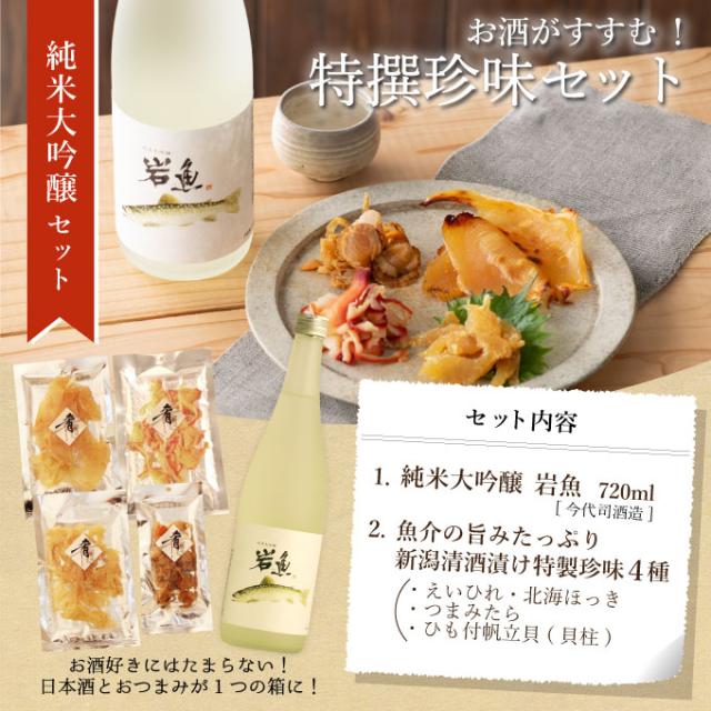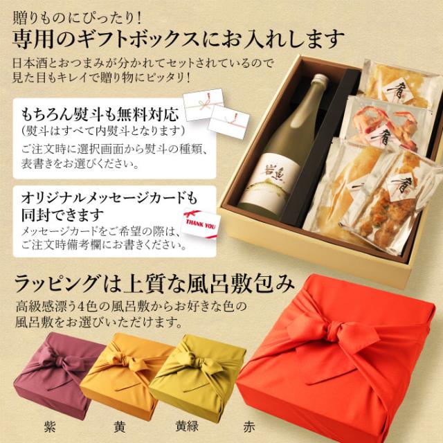 お歳暮 冬ギフト 日本酒 おつまみセット 純米大吟醸 原酒 岩魚720ml×海鮮珍味4種セット 退職祝い ギフト プレゼント 化粧箱 結婚祝い 内祝い 男性 女性 上司 高級 誕生日 還暦祝い 古希祝い 喜寿祝い 開業祝い 快気祝い 風呂敷包み 新潟