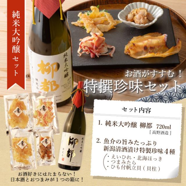 お歳暮 冬ギフト 日本酒 おつまみセット 純米大吟醸 柳都 越淡麗仕込み 720ml×珍味4種セット 常温 乾きもの 退職祝い ギフト プレゼント 化粧箱 結婚祝い 内祝い 男性 女性 上司 高級 誕生日 還暦祝い 古希祝い 喜寿祝い 開業祝い 快気祝い 新潟