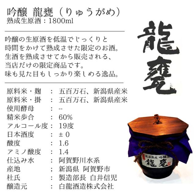 お歳暮 冬ギフト 日本酒 熟成生原酒 吟醸 龍甕(りゅうがめ)1800ml ギフト お酒 プレゼント 退職祝い 結婚祝い 内祝い 男性 女性 上司 誕生日 還暦祝い 古希祝い 喜寿祝い 開業祝い 快気祝い 贈答品 高級 新潟地酒 風呂敷包み お祝いの品