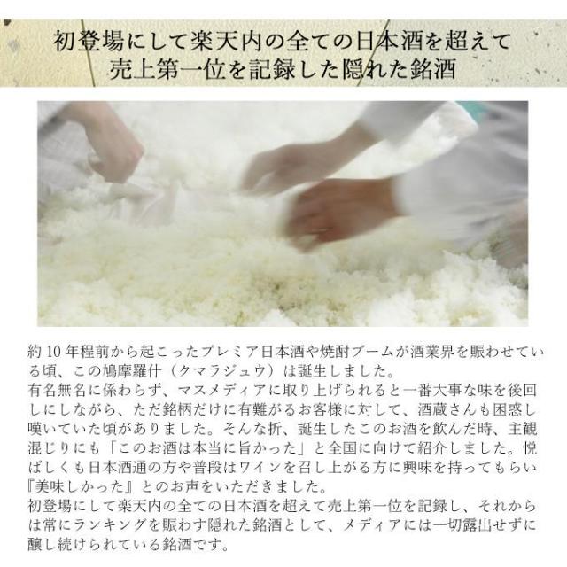 鳩摩羅什(くまらじゅう)は、日本酒通の方や普段はワインを召される方に興味を持ってもらい、飲んだ方からの美味しかったのお声と共に、初登場にして楽天内の全ての日本酒を超えて売上第一位を記録しました。