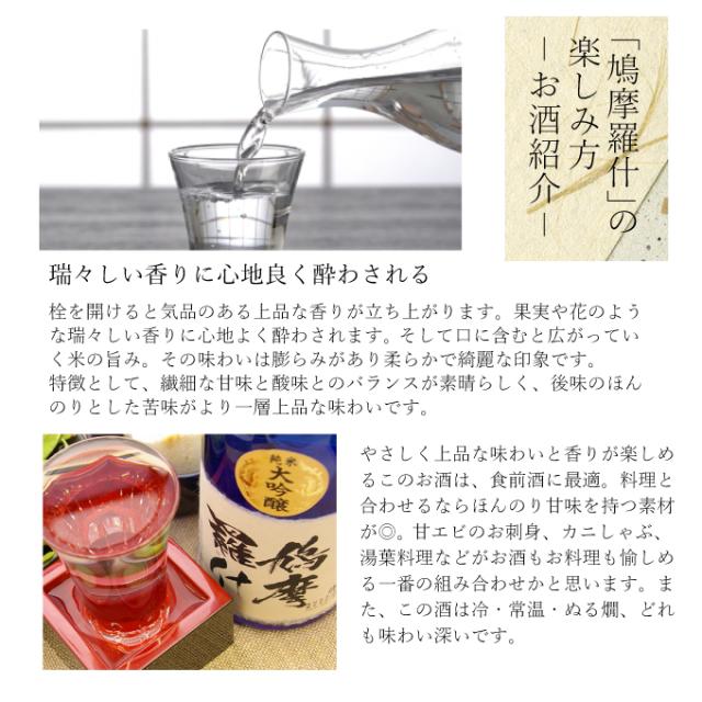 このお酒の名前である鳩摩羅什(くまらじゅう)とは、中国の南北朝時代初期に仏教経典を訳し、仏教文化において多大なる影響を与えるに至った伝説の僧の名前です。彼の名を付けたこのお酒は、世界に多大なる影響を与えた鳩摩羅什の名のもとに、美しきニッポンの酒(SAKE)を世界中に知ってほしいとの心内から純米大吟醸『鳩摩羅什』と名付けられました。