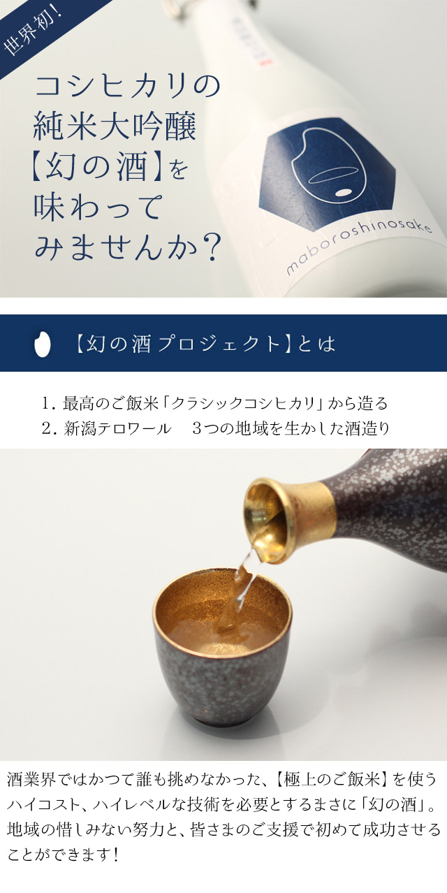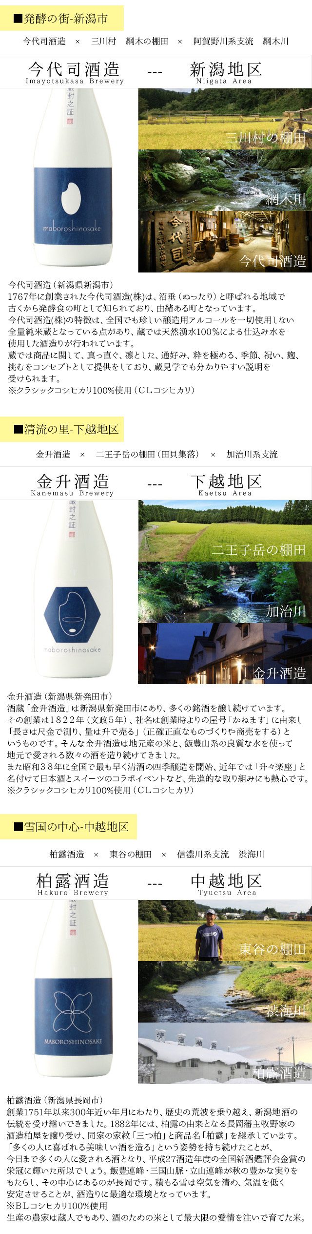 雪国新潟の雪解け水で育った棚田のクラシックコシヒカリは、岩魚や蛍も生息できるほどの綺麗な清水と自然豊かな土地で育ちました。生産量は新潟産コシヒカリのわずか1%ほどのまさに幻の米です。希少なご飯米を使って酒を作ることは、コストと技術を必要とされるため、どこの酒蔵も躊躇するような依頼でした。そんな挑戦を受けてくれた新潟を代表する3つの酒蔵を擁してクラウドファウンディングmakuakeで支援者を募集したところ、一週間で達成したプロジェクトがこちらです。