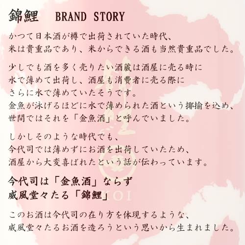 日本酒「錦鯉」は、錦鯉のように華やかで、清らかさの中に堂々とした味を感じられるお酒です。頭で飲む人が増えてしまった現代へのアンチテーゼとして、 酒のスペックは非公開とさせていただいていますが、 デザインだけでなく酒質についても国際的な評価をいただいているお酒ですのでご安心ください。頭で味や香りを捉えるのではなく、鼻と口、そして目で、純粋にお楽しみいただけますと幸いです。
