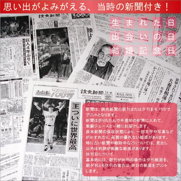 ●名入れラベルに、生まれた日や結婚記念日等の新聞一面をつけた、世界でひとつだけの紫蘇ジュース!