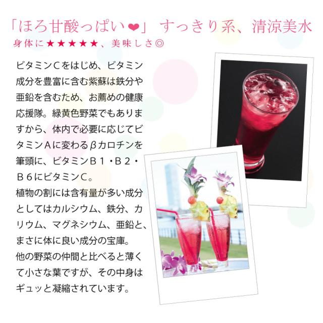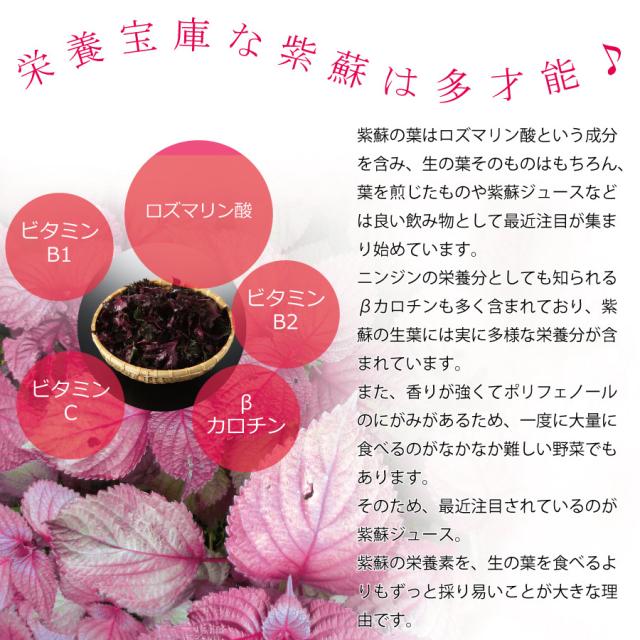 なお、紫蘇は使用頻度が高く、野菜としての栄養素が豊富でニンジンの栄養分としても知られるβカロチンも多く含まれております。紫蘇の生葉には実に多様な栄養分が含まれています。また、香りが強くてポリフェノールのにがみがあるため、一度に大量に食べるのがなかなか難しい野菜でもあります。そのため、最近注目されているのが紫蘇ジュース。紫蘇の栄養素を、生の葉を食べるよりもずっと採り易いことが大きな理由です。ビタミンCをはじめ、ビタミン成分を豊富に含む紫蘇は鉄分や亜鉛を含むため、お薦めの健康応援隊。緑黄色野菜でもありますから、体内で必要に応じてビタミンAに変わるβカロチンを筆頭に、ビタミンB1・B2・B6にビタミンC。植物の割には含有量が多い成分としてはカルシウム、鉄分、カリウム、マグネシウム、亜鉛と、まさに体に良い成分の宝庫。他の野菜の仲間と比べると薄くて小さな葉ですが、その中身はギュッと凝縮されているのですね。