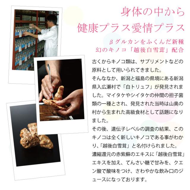 新潟県の契約農家で農薬を全く使わずに作られた赤紫蘇のエキスに 「越後白雪茸」エキスを加え、てんさい糖で甘みを、クエン酸で酸味をつけ、さわやかな飲み口のジュースになっております。