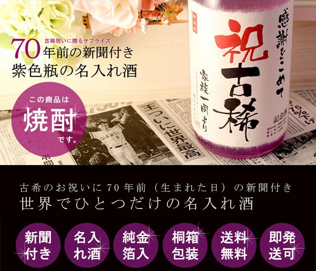 古希祝い 70年前の新聞付き名入れ酒 純米大吟醸酒の酒粕からできた焼酎【華乃菫】 1800ml ギフト プレゼント 誕生日 記念品 贈答品 男性 女性 祖父 祖母 高級 父 母 おじいちゃん おばあちゃん 上司 恩師 先生 兄弟 親戚 桐箱入り 風呂敷包装