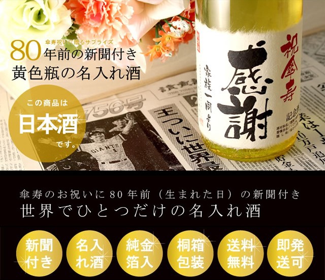 傘寿祝い 名入れ日本酒 純米大吟醸 80年前の新聞付き【巴月】720ml ギフト プレゼント 誕生日 記念品 贈答品 高級 男性 女性 祖父 祖母 高級 父 母 おじいちゃん おばあちゃん 上司 恩師 先生 兄弟 親戚 桐箱入り 風呂敷包装