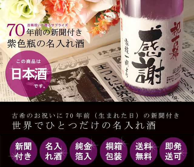 古希祝い 名入れ日本酒 純米大吟醸 70年前の記念日の新聞付き 【紫式部】 720ml ギフト プレゼント 誕生日 記念品 贈答品 男性 女性 祖父 祖母 高級 父 母 おじいちゃん おばあちゃん 上司 恩師 先生 兄弟 親戚 桐箱入り 風呂敷包装